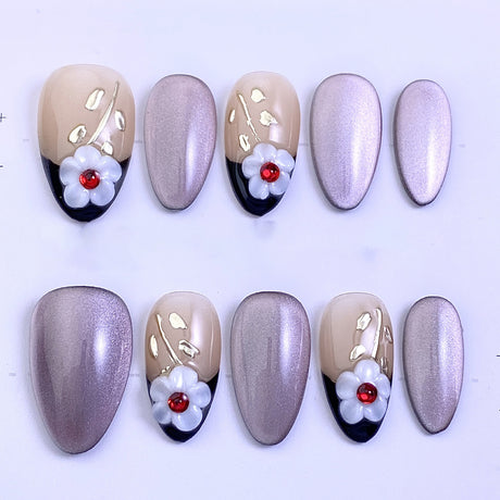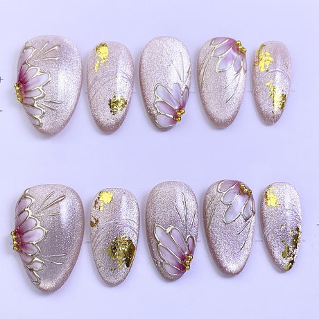 (Handmade) 10pcs/Set 3D Floral Gilded Cat Eye Press-On Nails