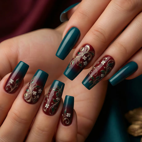 (Handmade) 10pcs/Set Red Gold Foil Hand-Painted Floral Press-On Nails