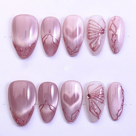 (Handmade) 10pcs/Set Sparkly Rhinestone Butterfly Cat Eye Hearts Press-On Nails