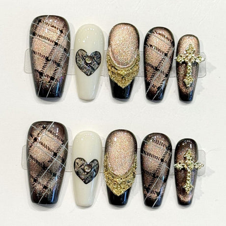 (Handmade) 10pcs/Set Black & Gold Plaid Heart Cross Cat Eye Press-On Nails