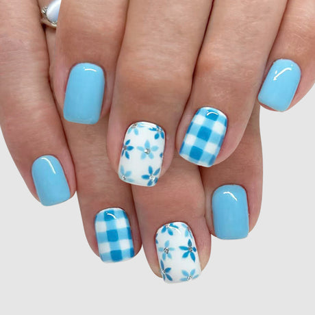 24pcs/Set Blue Floral Plaid Press-On Nails
