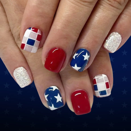 24pcs/Set Red & Blue Color-Block Star Plaid Press-On Nails