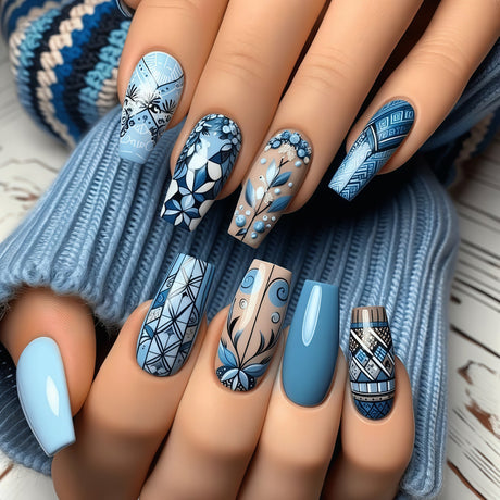 24pcs/Set Light Blue Geometric Floral Pattern Press-On Nails