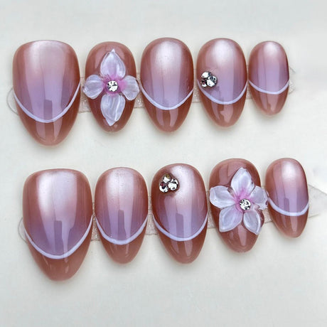 (Handmade) 10pcs/Set Light Purple Cat's Eye with Hand-Painted Flowers Short Press-On Nails