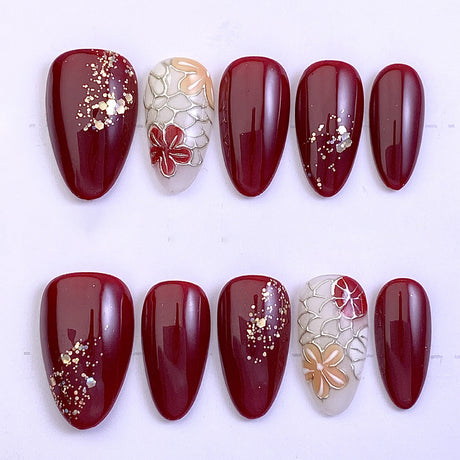 (Handmade) 10pcs/Set Red Flowers Leaves Press-On Nails