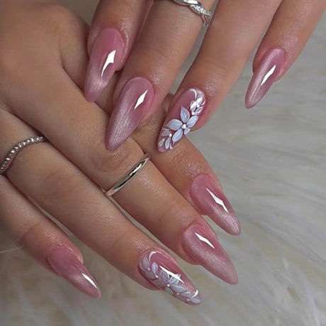 24pcs/Set Pink Cat Eye White Flowers Press-On Nails