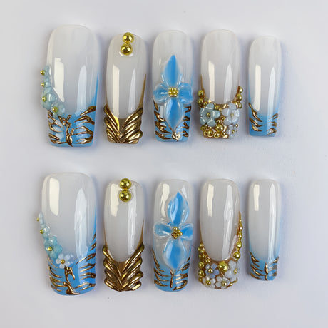 (Handmade) 10pcs/Set Blue 3D Flower Gold Zebra French Press-On Nails