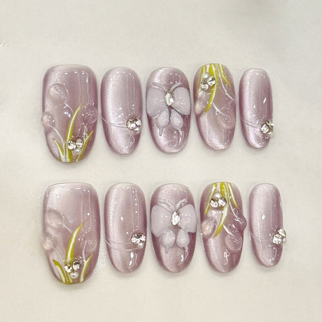 (Handmade) 10pcs/Set Light Purple Cat's Eye with Hand-Painted Flowers Short Press-On Nails