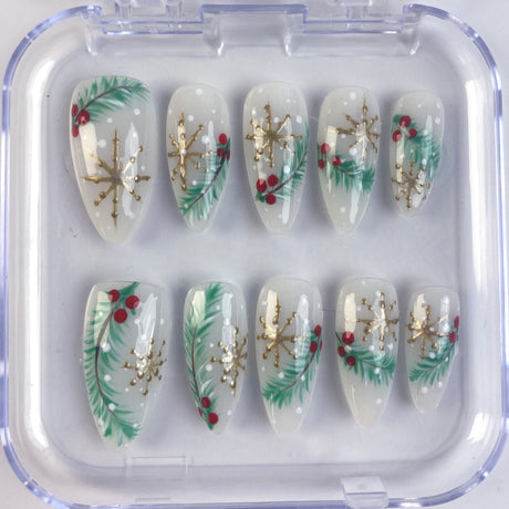 (Handmade) 10pcs/Set Green & White Snowflake Christmas Press-On Nails