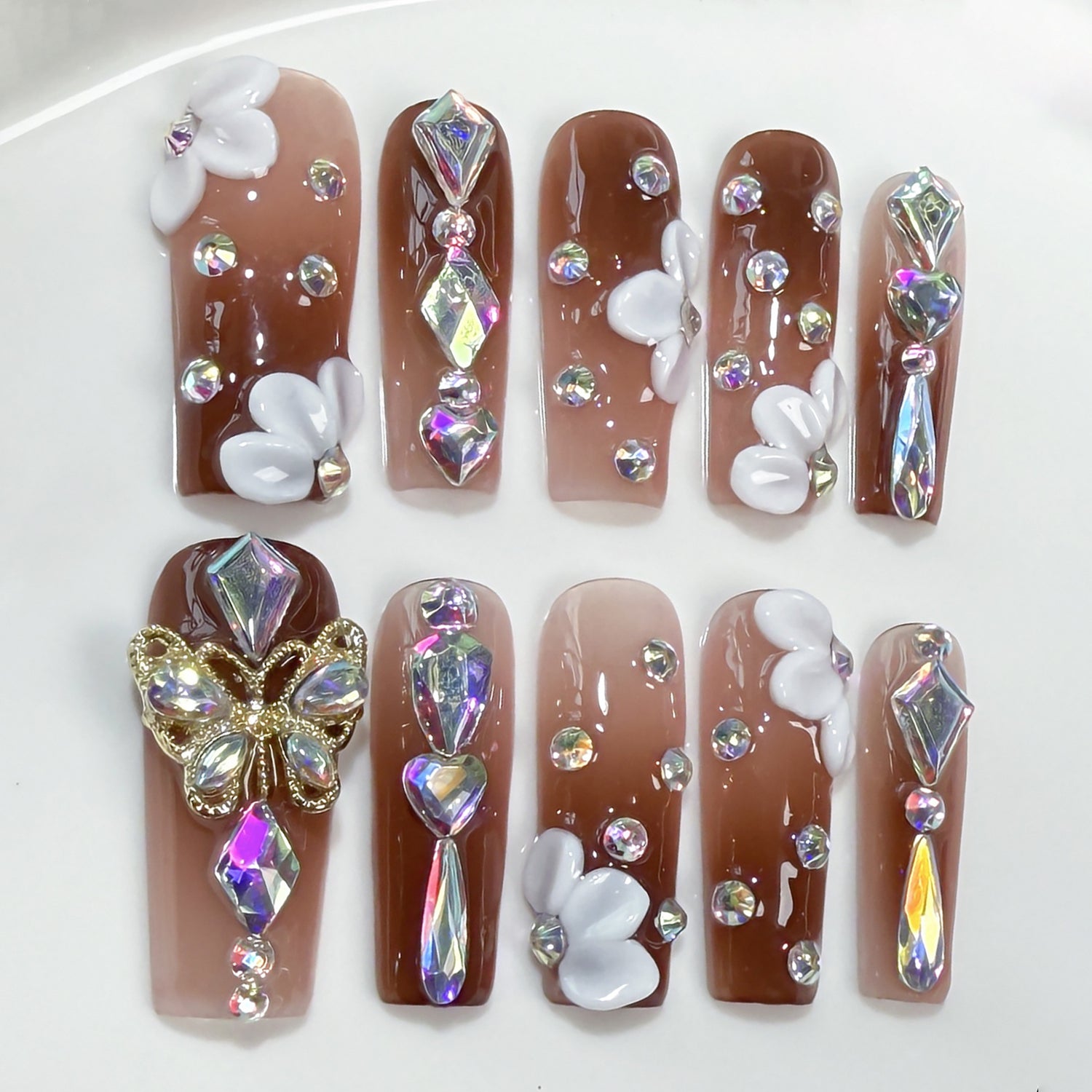 (Handmade) 10pcs/Set 3D Carved Gradient Glitter Shine Press-On Nails